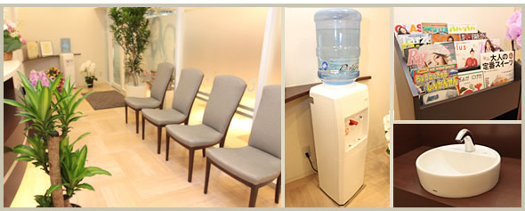 待合室にはお一人掛けの椅子を設置しております。お掛けになってお待ちください。また、ご自由にご利用いただける各種情報雑誌・ウォーターサーバーをご用意しております。