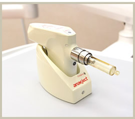 麻酔をしても治療中に痛みを感じるのは、手動による麻酔注入で注入スピードを不安定にするためにおこります。電動麻酔機をつかうことにより一定スピードでの麻酔注入が可能になり患者様への痛みによる負担を軽減することが出来ます。